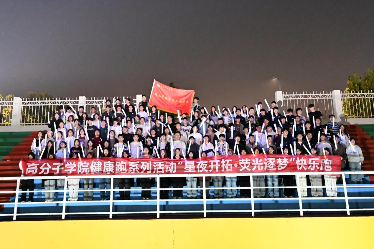 活动第一阶段在学生会体育部的统筹组织下有条不紊地推进。同学们沿着操场跑道完成两圈集体跑步,夜色之中,闪烁的荧光与奔跑的身影相互映衬,不仅生动展现出高分子学子良好的精神风貌与过硬的身体素质,更让大家在集体奔跑的过程中深刻体会到:面对成长路上如黑夜般的挑战与荆棘,身边始终有并肩前行的伙伴,共同传递着青春的力量。
